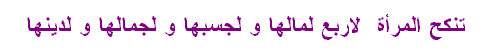 Wanita itu dikahwini kerana 4 perkara ,iaitu kerana Hartanya(kekayaannya),Keturunannya,kecantikannya dan kerana Agamanya.Pilihlah yang beragama supaya engkau akan selamat "( Riwayat Al-Bukhari)